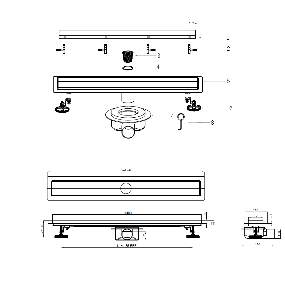 DRN110 CHROME SHOWER DRAIN DOUBLE FUNCTION 40CM